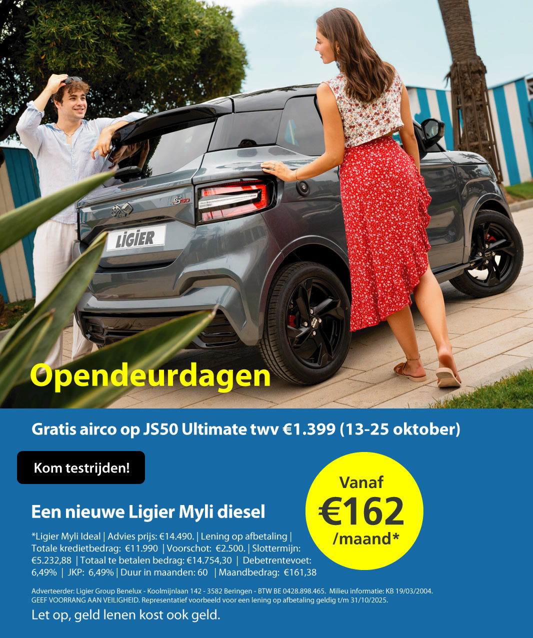 *Ligier Myli Ideal | Advies prijs: €14.490. | Lening op afbetaling | Totale kredietbedrag: €11.990 | Voorschot: €2.500. | Slottermijn: €5.232,88 | Totaal te betalen bedrag: €14.754,30 | Debetrentevoet: 6,49% | JKP: 6,49% | Duur in maanden: 59 | Maandbedrag: €161,38 Let op, geld lenen kost ook geld. Adverteerder: Ligier Group Benelux – Koolmijnlaan 142 – 3582 Beringen – BTW BE 0428.898.465. Milieu informatie: KB 19/03/2004. GEEF VOORRANG AAN VEILIGHEID. Let op, geld lenen kost ook geld. Representatief voorbeeld voor een lening op afbetaling geldig t/m 31/10/2025.